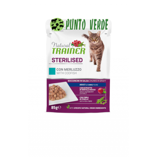 Natural Trainer Adult Sterilised, prodotto con merluzzo e ingredienti funzionali come il mirtillo rosso, è una gustosa alternativa di bocconcini in salsa, per soddisfare tutte le esigenze del vostro gatto sterilizzato.